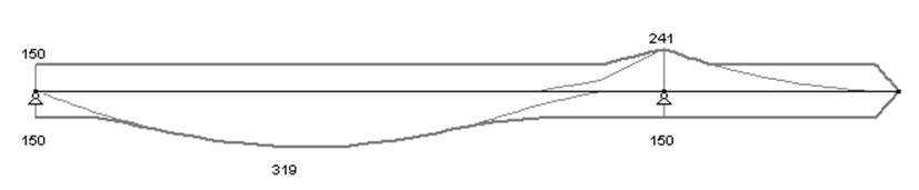 La ligne fine représente la quantité de renfort nécessaire pour atteindre uniquement l’état limite ultime. La ligne épaisse représente ces quantités augmentées pour tenir compte de la limitation des contraintes dans les états limites de service, tout en respectant les pourcentages minimaux d’armature et tout risque de fléchissement.